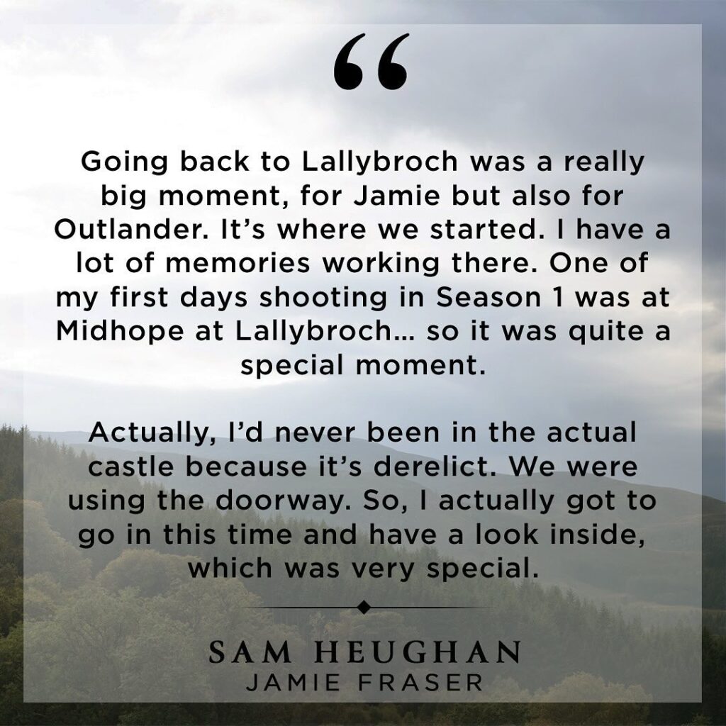Returning to Lallybroch and the location of Midhope Castle where Outlander films wasn’t just magical for the fans but for the cast as well. Sam Heughan says this was his favorite location from this second half of the season.
