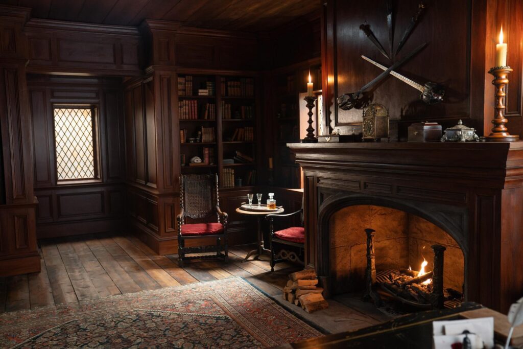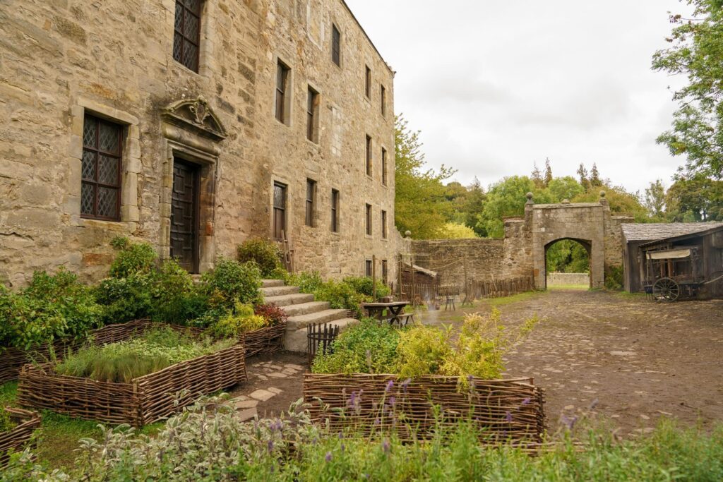 Fans will be delighted to see Jamie and Claire staying in the Laird’s bedroom again with the iconic blue wallpaper. Set Decorator Stuart Bryce says of this room: “There is something about that blue that makes people’s skin look amazing and enhanced those early romantic scenes of Jamie and Claire. When we came to put the room back together, though it was exactly the way it should have been, by some mystery, the room was bigger…something spooky happened there!”