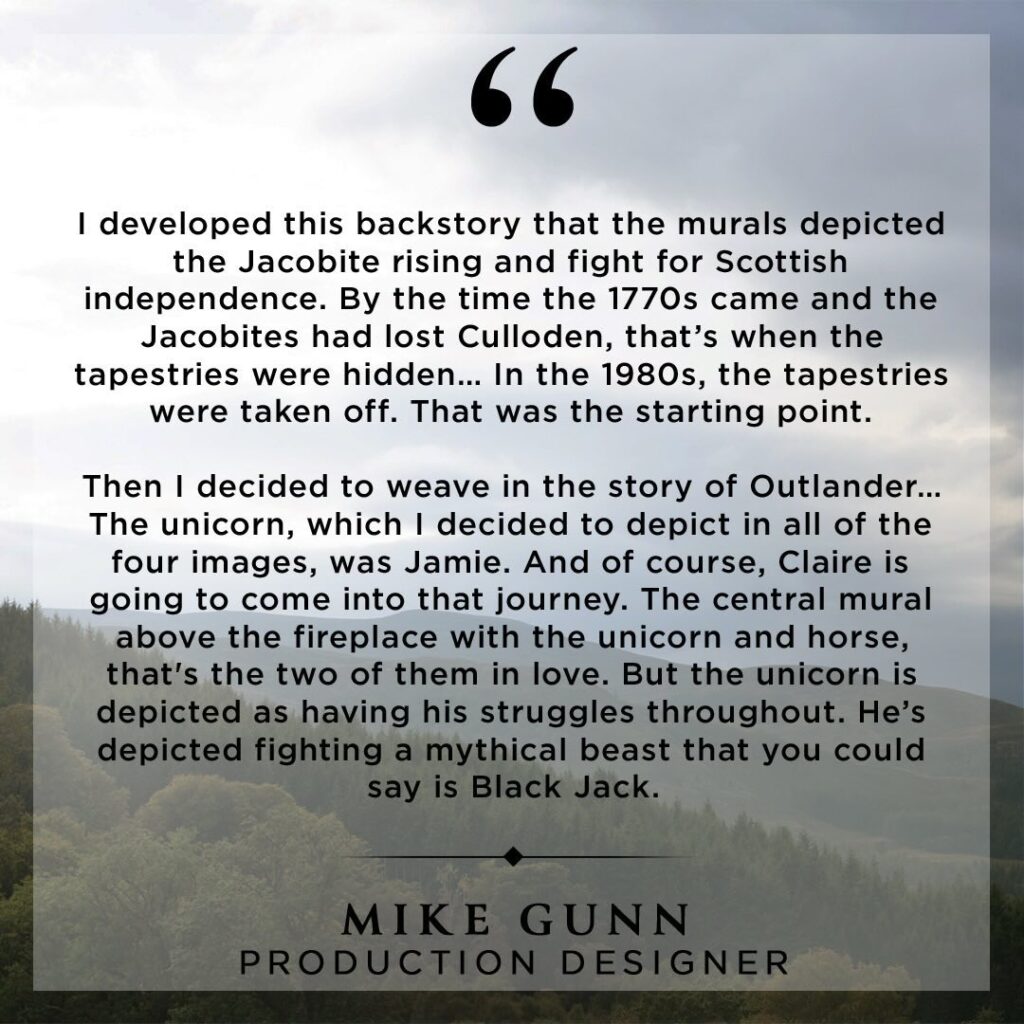 For Production Designer Mike Gunn, now that we’re seeing Lallybroch in 1739 as well as the 1770s and 1980s, it was important to instantly recognize Roger was in a different time. He came up with the idea that behind the incredible tapestries from Season 1, there were murals created in the time of Brian Fraser, hidden after Culloden, then discovered by Bree and Roger in the 80s.