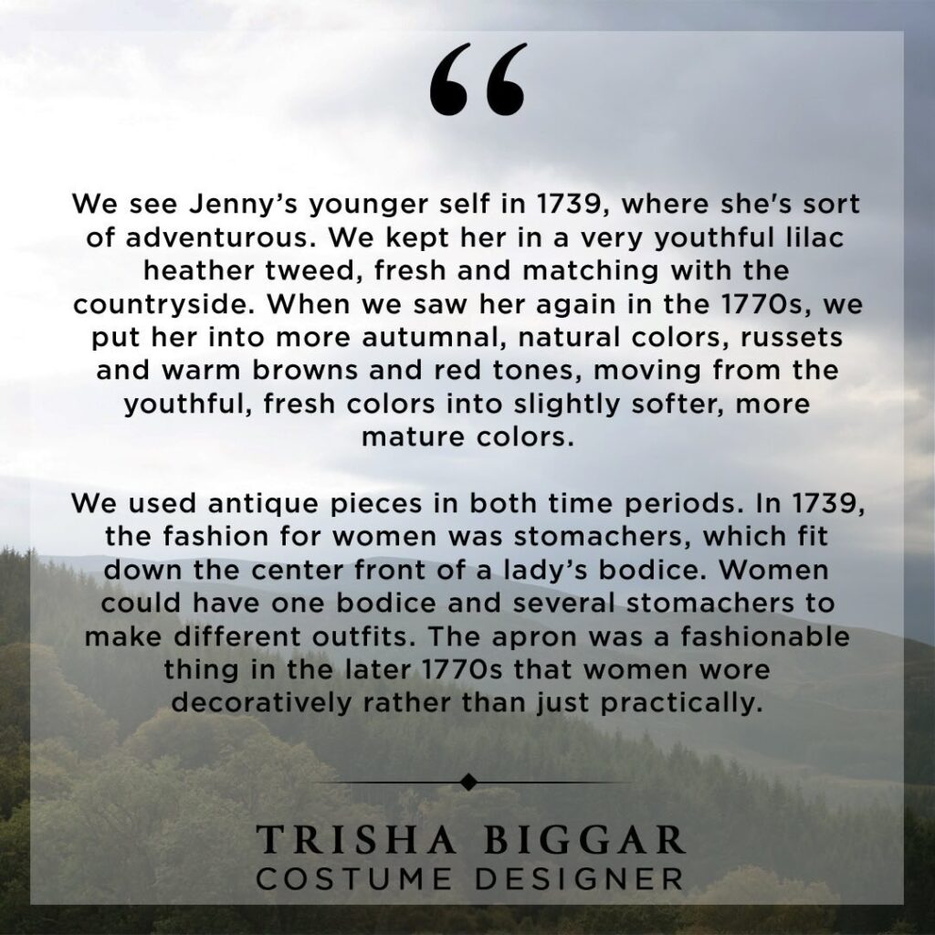 Said Caitríona Balfe, “Stepping into a role set by another actor is one of the hardest things to do… but Kristin really knocked it out of the park… She was wonderful.”Learn how Costume Designer Trisha Biggar approached Jenny’s looks in 1739 and 1778.