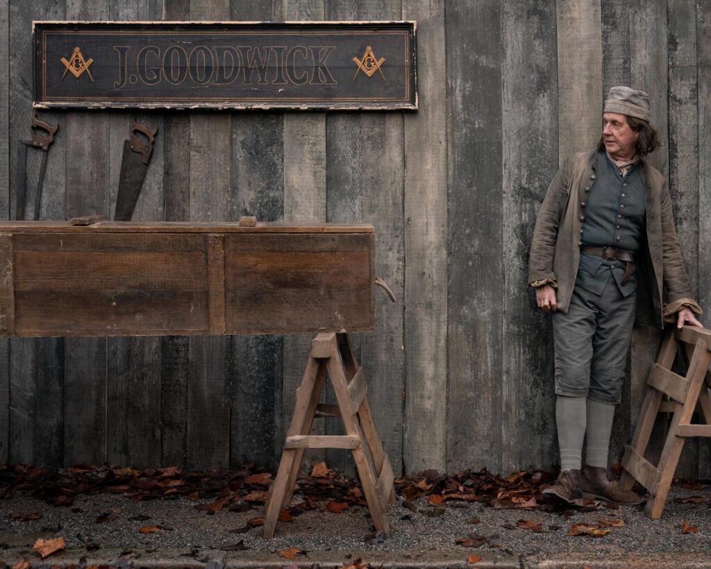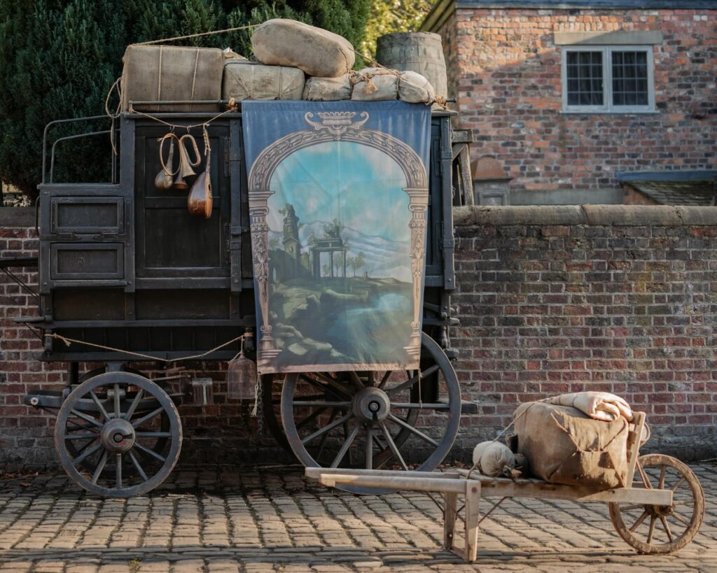 The Set Decoration team researched paintings and history books to bring the vision of an 18th century market to life. Foundries, wheelwrights, tanneries, cannon makers, carts, carriages and even a mobile theatre make an appearance—a true feast for the eyes!