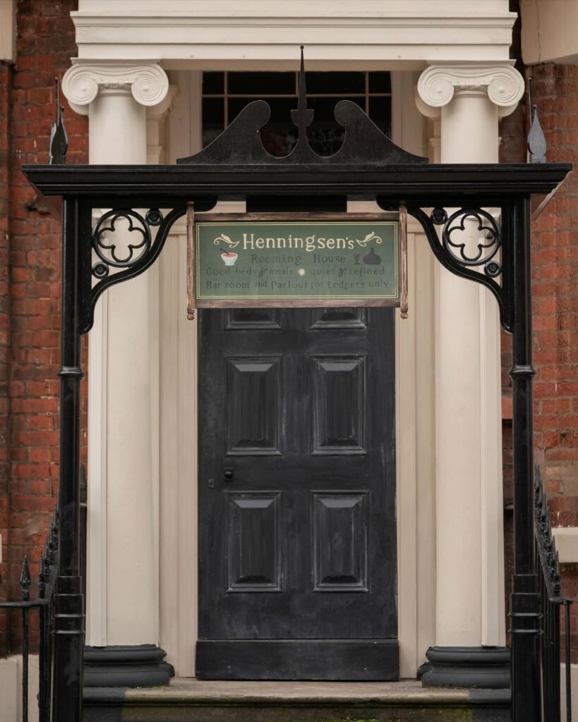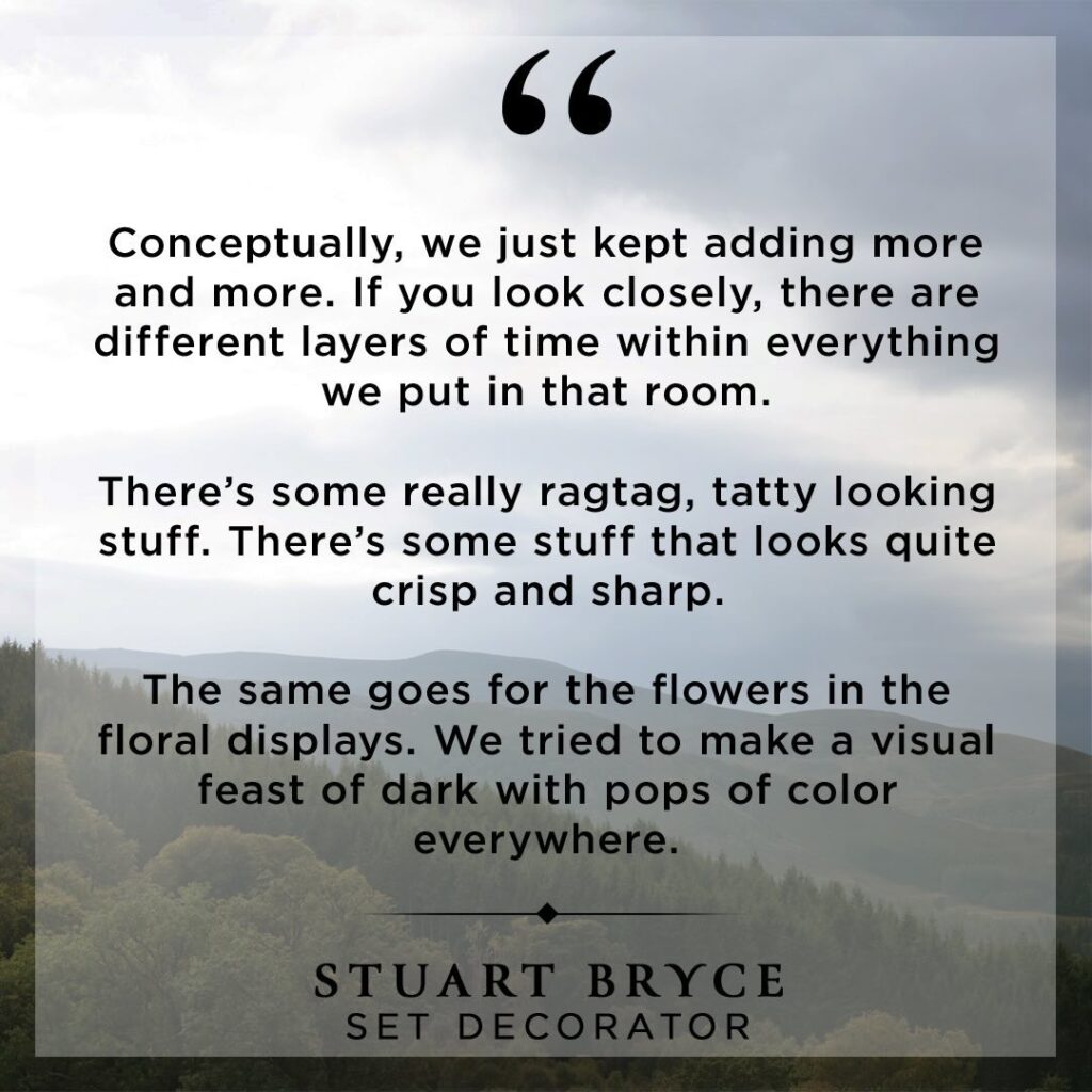 As for the brothel space, Production Designer Mike Gunn and Set Decorator Stuart Bryce opted for a dark, simple color palette, electing instead to build color and texture through textiles, props, and an abundance of flowers.