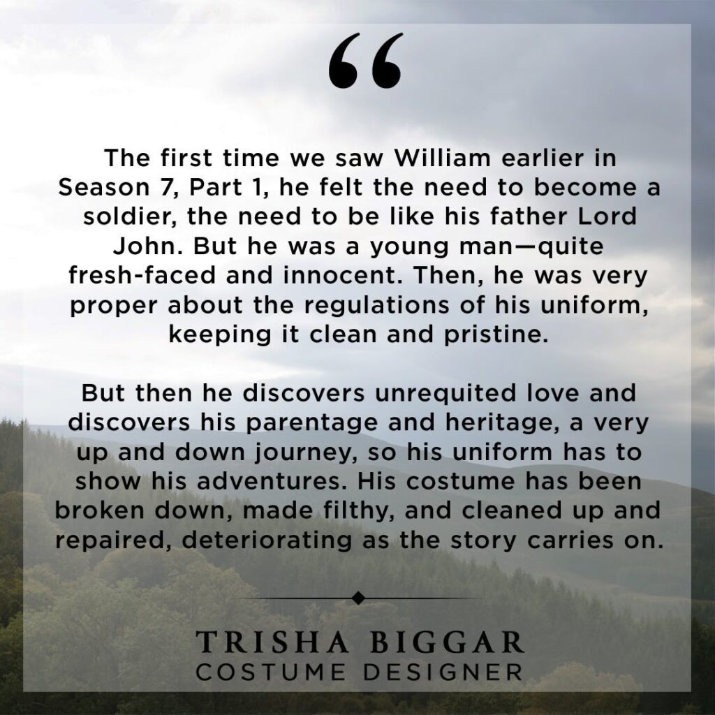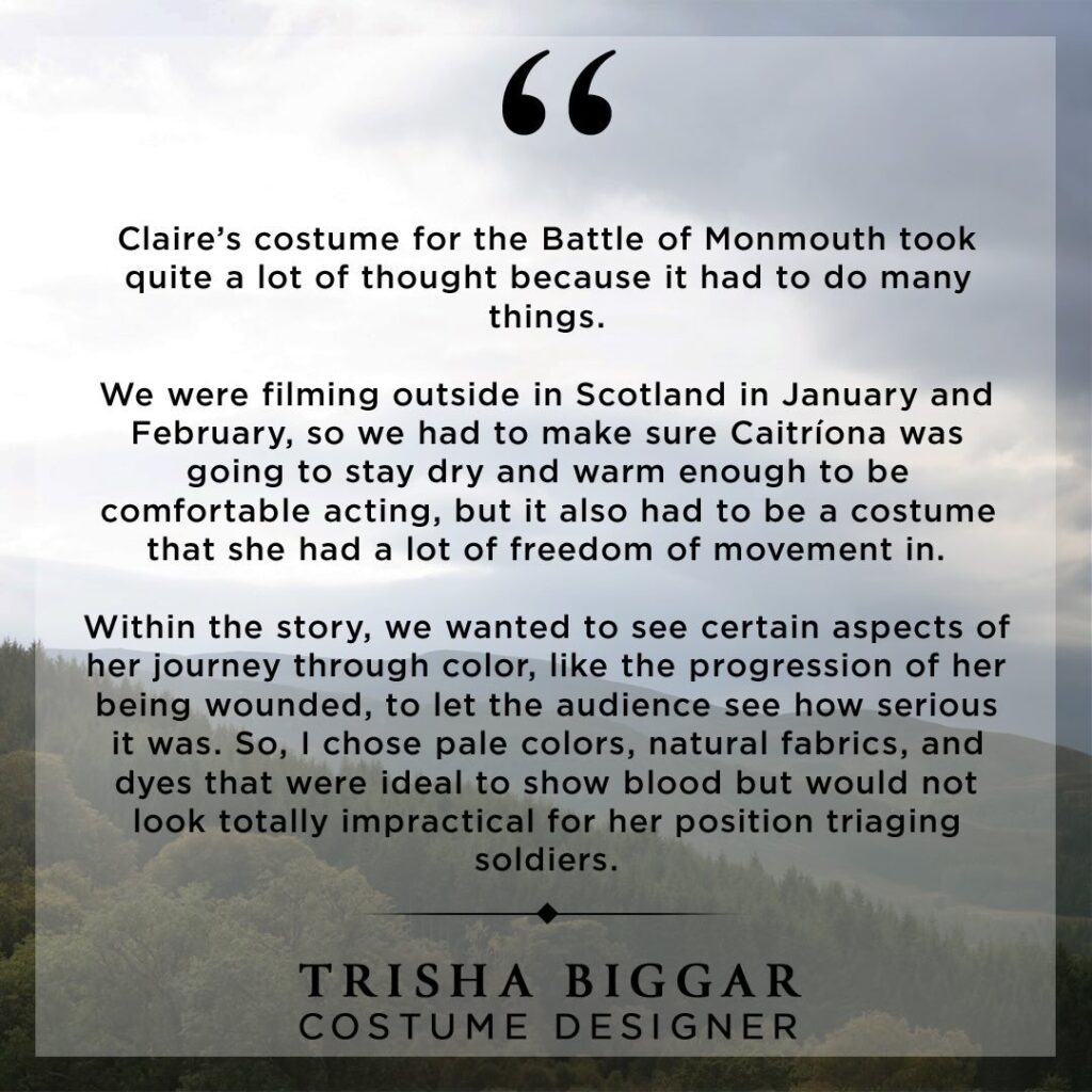 Caitríona Balfe was a fan as well, saying, “To me, this costume–the linen waistcoat and jacket when she’s in the field hospital–screams practicality but it also looks cool. That, to me, is just very Claire.”