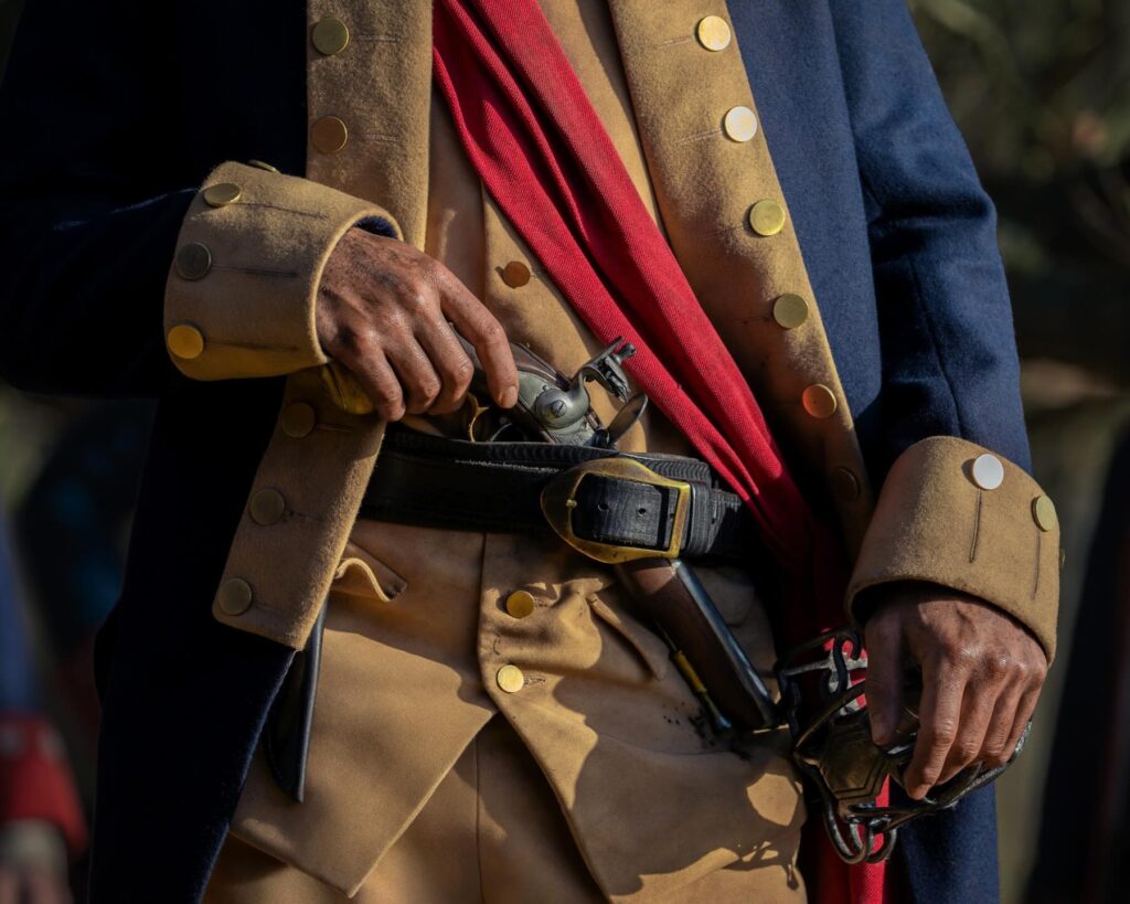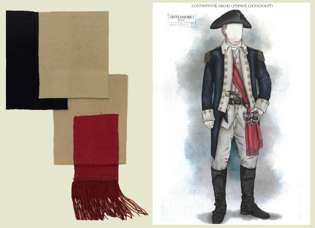 The iconic blue and buff colors match the Continental General’s uniform worn by Washington himself, while the red sash identifies Jamie’s rank as Brigadier General.