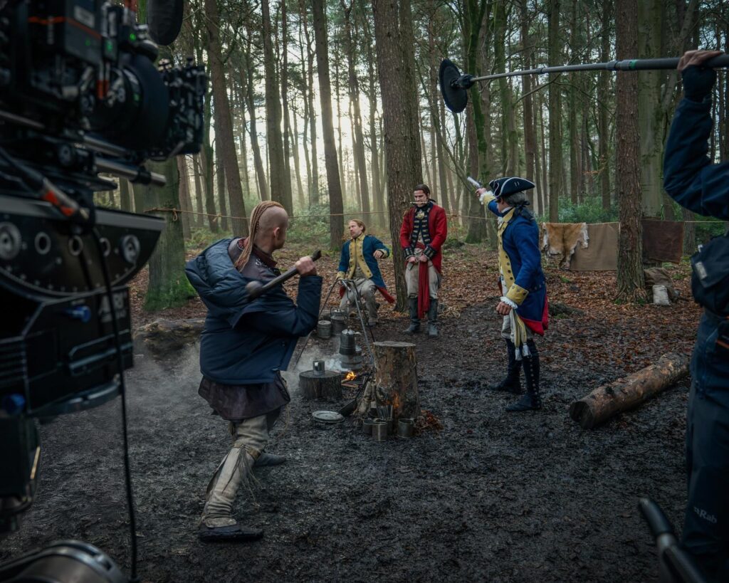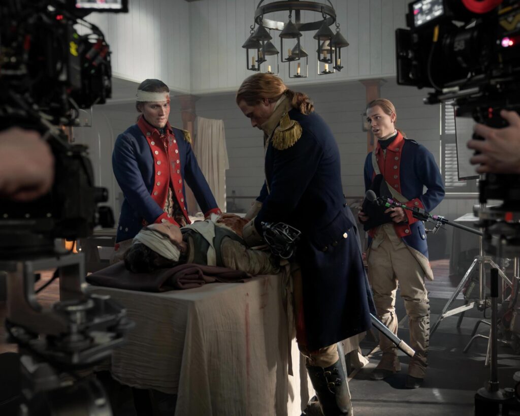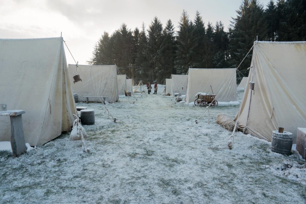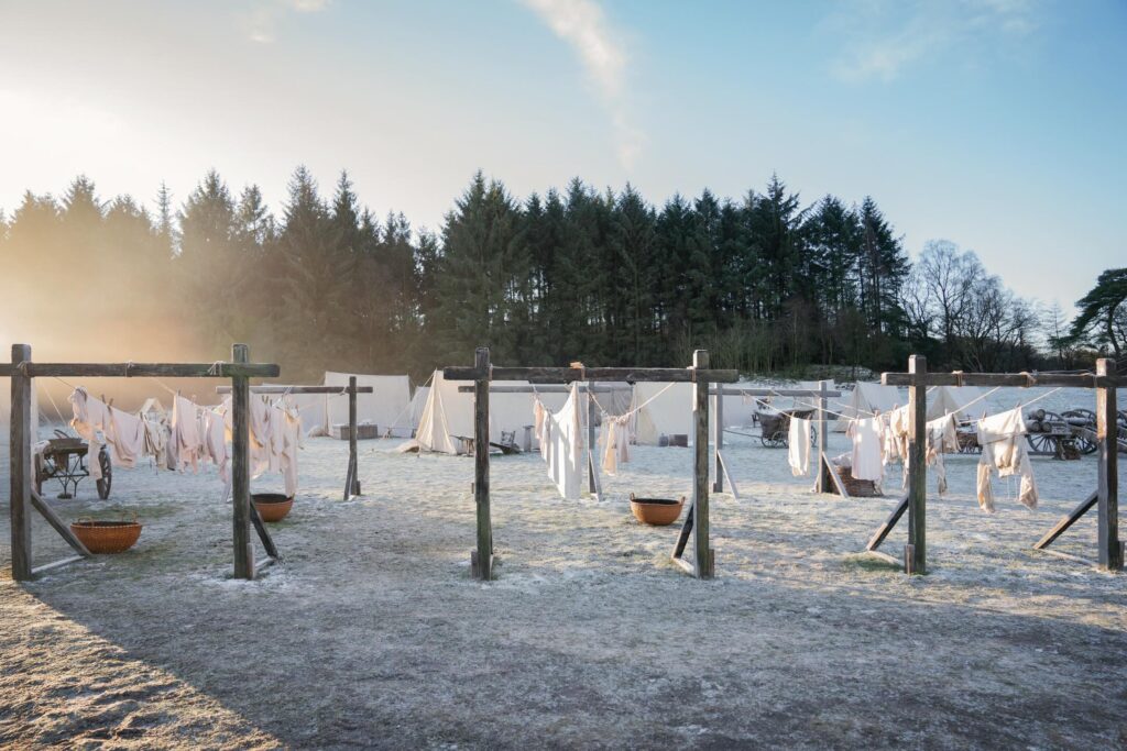Said Set Decorator Stuart Bryce, “As the season progressed, we applied more decay to the environment. The tents got ripped. We patched them up even if they didn’t need patching up. Everything was muddy or grubby. The weather helped us. As we went from Saratoga to the Battle of Monmouth, the camps got bigger. We used every single asset we had and half of it blew away every other day.” Ah, Scotland!
