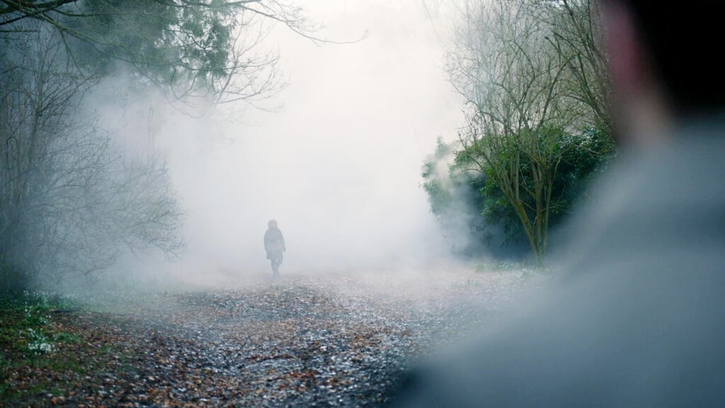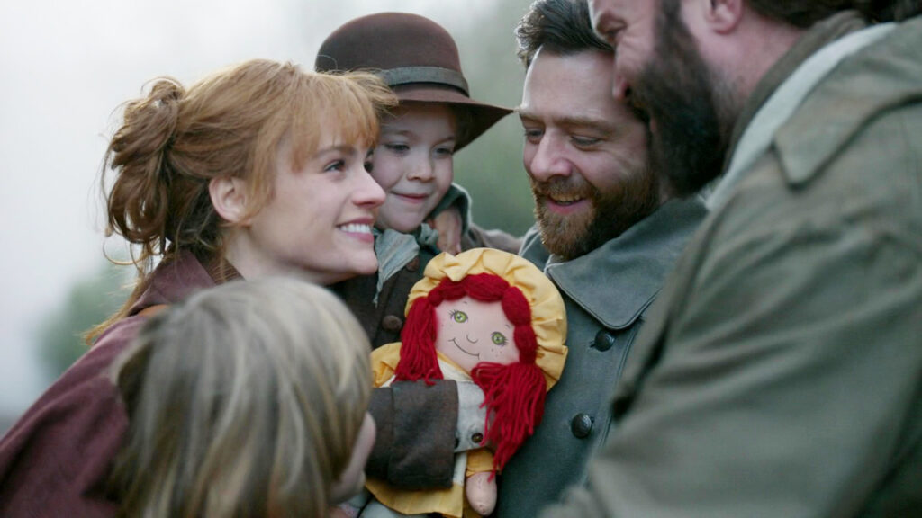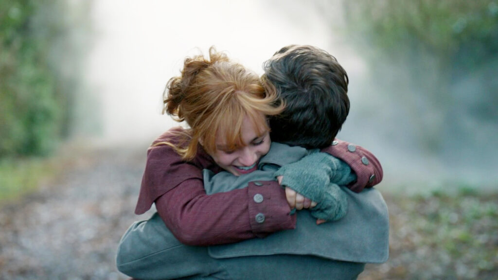 In 1739, Buck and Roger leave Lallybroch when Jem appears in the road and runs into Roger’s arms. Buck looks choked up. Jem tells Roger he’s been with Mandy, which is an odd thing to say considering he’s been with his mom and Mandy. Brianna and Mandy also run out from the fog and the family embraces. Brianna includes Buck in the lovefest.