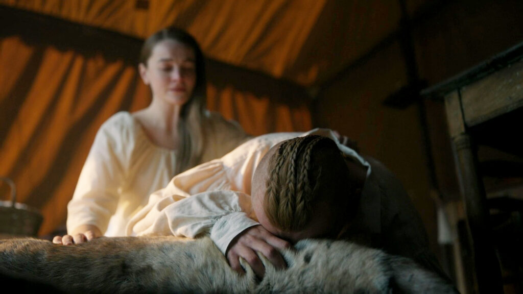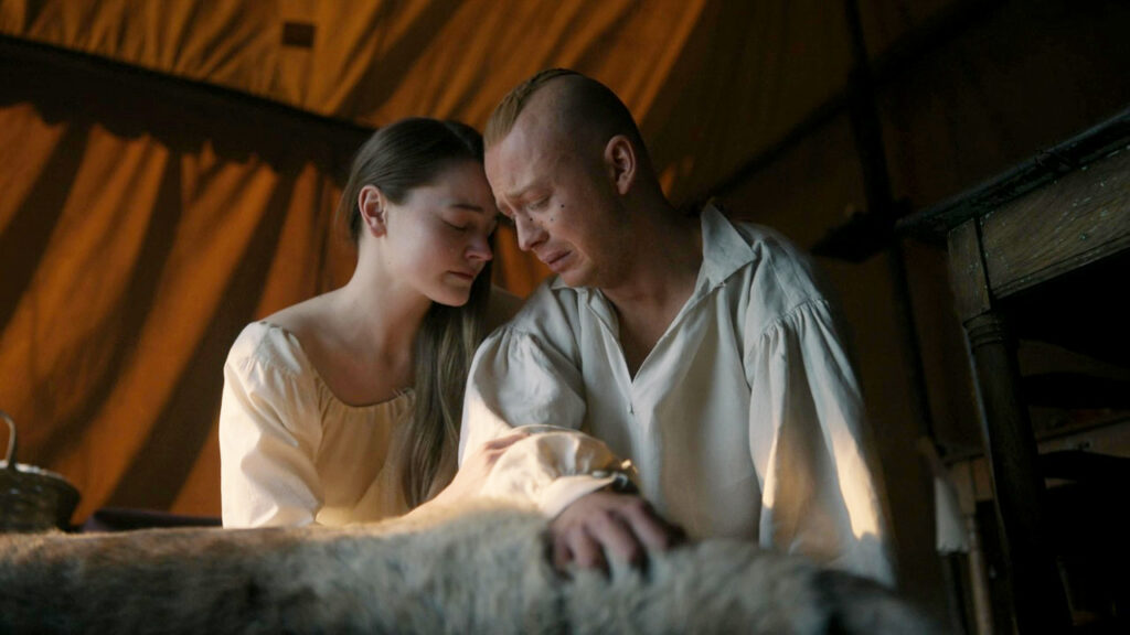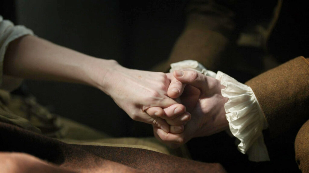 One week later, at the Tennent Church, Claire needs to get us to “make water” and really doesn’t want Jamie’s help. Jamie insists as she’s “done a great many worse things for me.” He helps her whether she likes it or not and then the two climb into the bed together and hold each other. Claire asks that they go home and Jamie agrees.